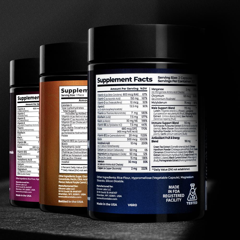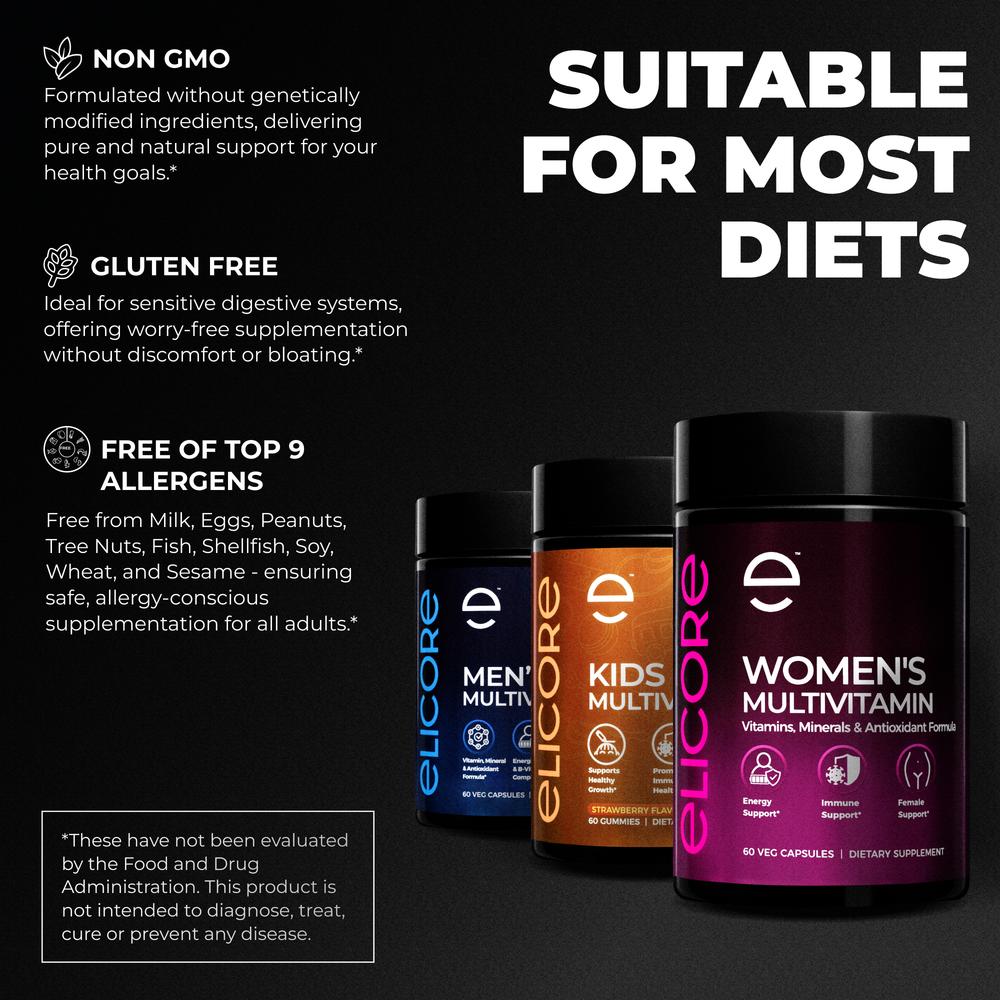 ELICORE Multivitamin Family Bundle is designed for families looking to support their daily health and vitality. Whether you're an active adult striving to maintain well-being and energy, or a parent focused on supporting your child's healthy growth and overall development, this bundle provides essential nutrients for every family member. It's a convenient option for busy households prioritizing wellness and an active.
