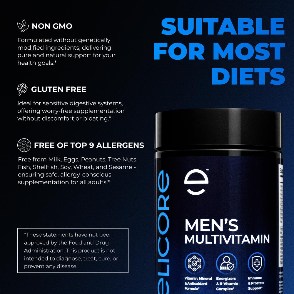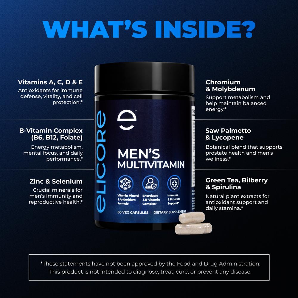 ELICORE Men's Multivitamin contains a comprehensive blend of essential vitamins, minerals, and antioxidants specifically designed for men's health. Ingredients like Vitamin D and Zinc support immune health and contribute to overall well-being, while the Male Support Blend provides support for men's unique needs.