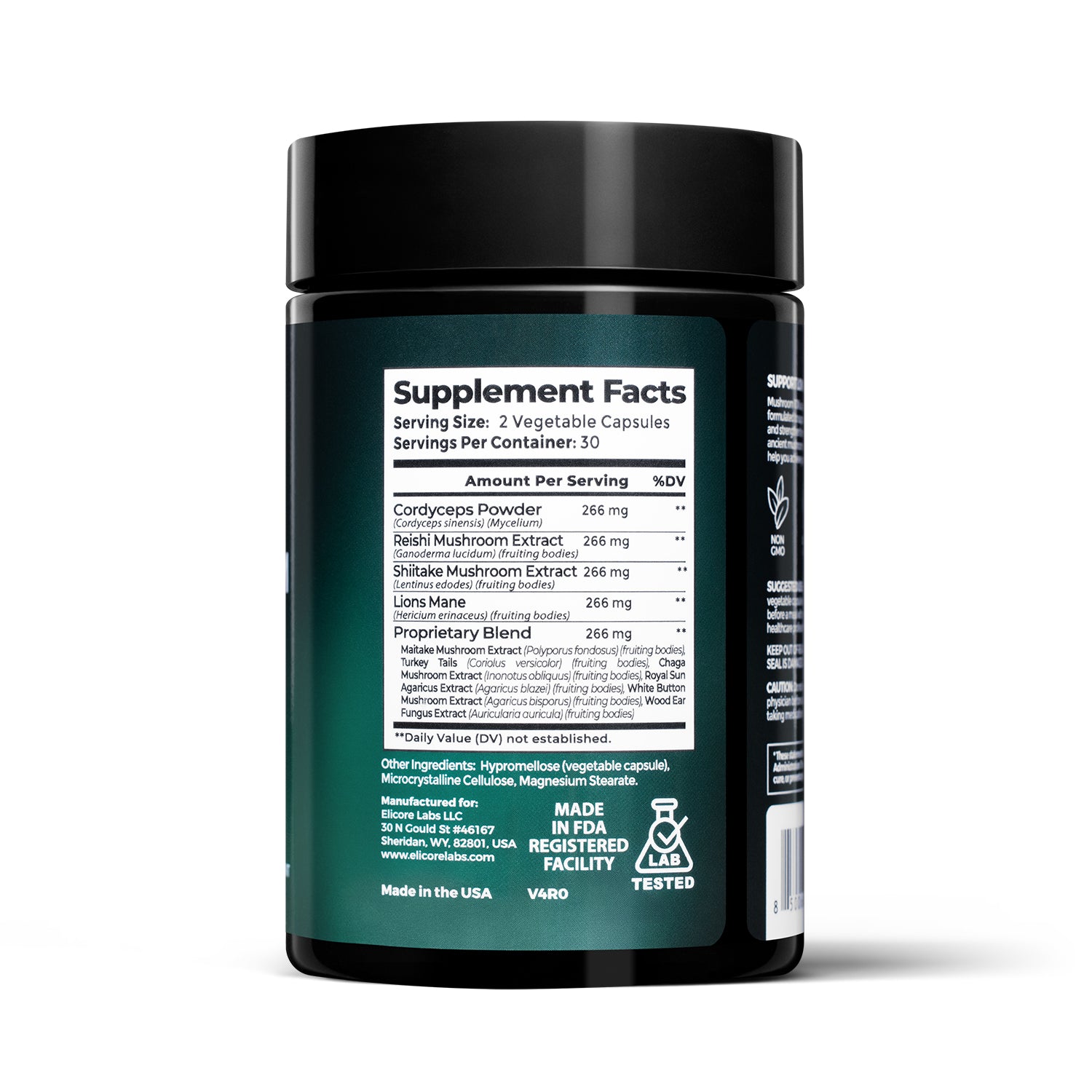 Elicore MUSHROOM 10X harnesses the power of 10 different mushrooms to provide a wide range of health benefits. Each mushroom, such as Chaga, Turkey Tail, and Wood Ear, brings unique properties to the formula, creating a synergistic effect that supports mental, physical, and immune health in one convenient supplement.