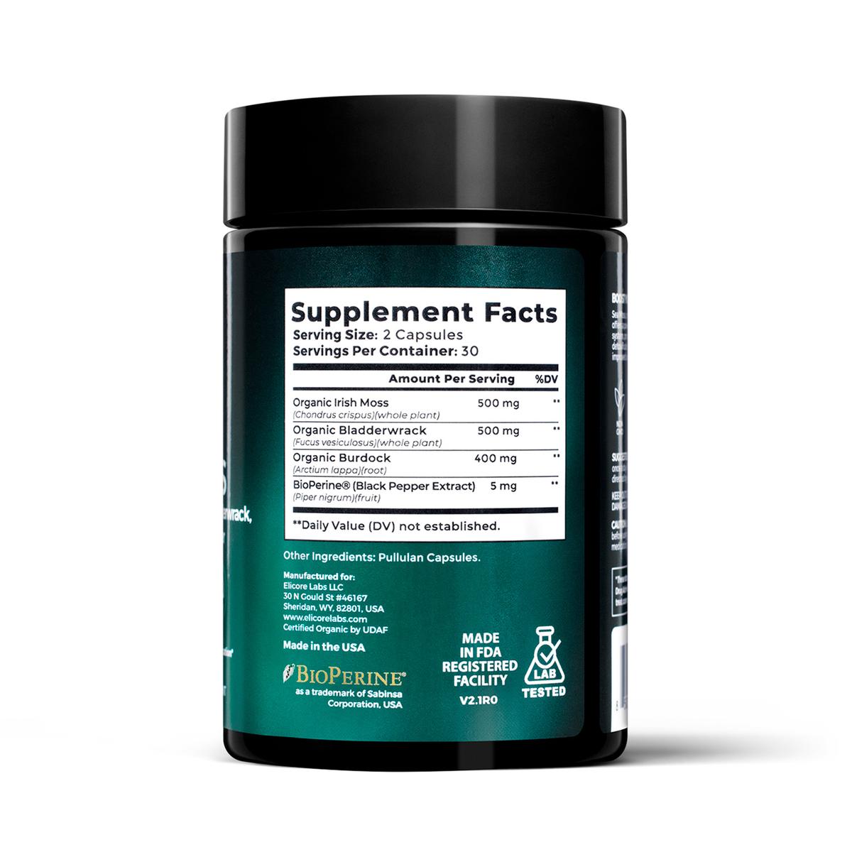Elicore Organic Sea Moss aids natural detoxification. Ingredients like Burdock root are known for their ability to cleanse the bloodstream and support liver function. Combined with Irish Moss and Bladderwrack, this supplement helps flush out toxins and promote a healthier body.